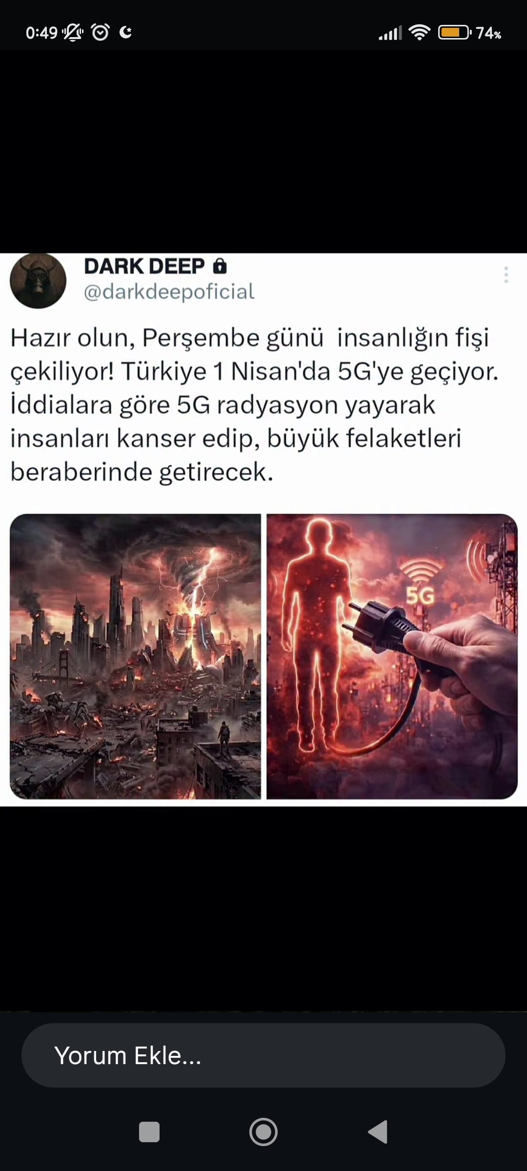 Katılıyorum bir de insanlığın fişi zaten çekildi gazzenin durumu kapanan mescide yaplan haksızlıklar çocuklara yapılan pislikler o yüzden 5 g koymaz bize şayet böyle bir durum varsa