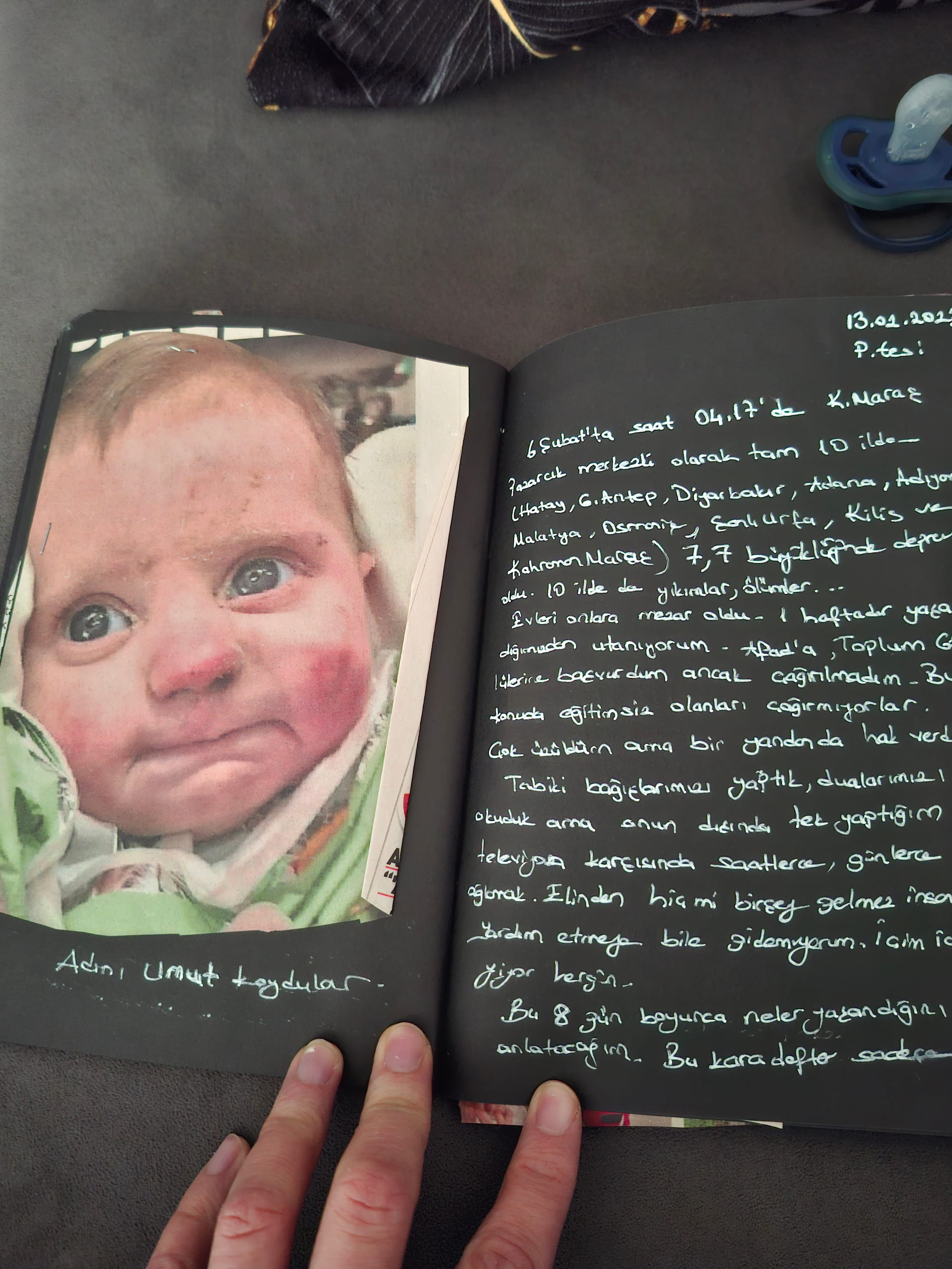 Önce bir sağa sola sallandı sonra şiddeti artti kavisli şekilde sallanmaya başladı evimizin çok yakınında bir camii yıkıldı onun sesi, evden dışardan gelen sesler kıyamet kopuyor sandım. Eşim o gün evdeydi elimden tuttu yatağın yanına çöktük bitmesini bekledik ama o kadar uzun geldi ki üzerimize doğru düşenlerden biri bile bana denk gelmedi eşim beni korumak için sımsıkı sarılmıştı. Dışarı çıktık üzerimizde ince pijamalar üzerine mont aldık eşim battaniye aldı. Arabaya giderken apartman girisindeyken bir daha oldu ama hiç artçı değilmis gibi büyük bir deprem gibiydi. Ailelerimize ulaşamadık ulaşana kadar ağladım komşularımızı aradık bize sağ olduklarını söylesinler diye. Zaten arabaya bindik telefon çaldı eşimi göreve çağırdılar o eve kamuflajı almaya giderken sen gelme dedi bende koştum elinden tuttum yaşarsam da ölürsem de seninle olayım dedim. Hazırlandı gitti kahramanmaraşa ordan gaziantep e ordan hataya günlerce gelmedi ben iki gün araba da tek başıma kaldım sonra eşimin iş yerinden çağırdılar biraz da orda kaldım sonra ablamlar geldi beni aldı adıyamana gittik özellikle adıyamanın ilçesi gölbaşından geçerken ağlamaktan helak olduk. Dayım halam kuzenlerim arkadaşlarım komşularım çoktan ebediyete uğurlanmıştı. Hala mezarı bile olmayan arkadaşlarım var bulunmayan onlarca tanıdığım var. Kendi memleketimi tanıyamadım en acısı da şehrin kokusunu bastırmak için sıkılan kokulardı. Ceset kokusu … Enkazların başında bekledik iş makineleri aradık konteynerlar çadırlar kurduk. Yemekler dağıttık battaniyeler ısıtıcılar dağıttık ama kimsenin karnı da doymadı içi de ısınmadı çünkü yüreğimiz üşümüştü kalbimiz açtı …