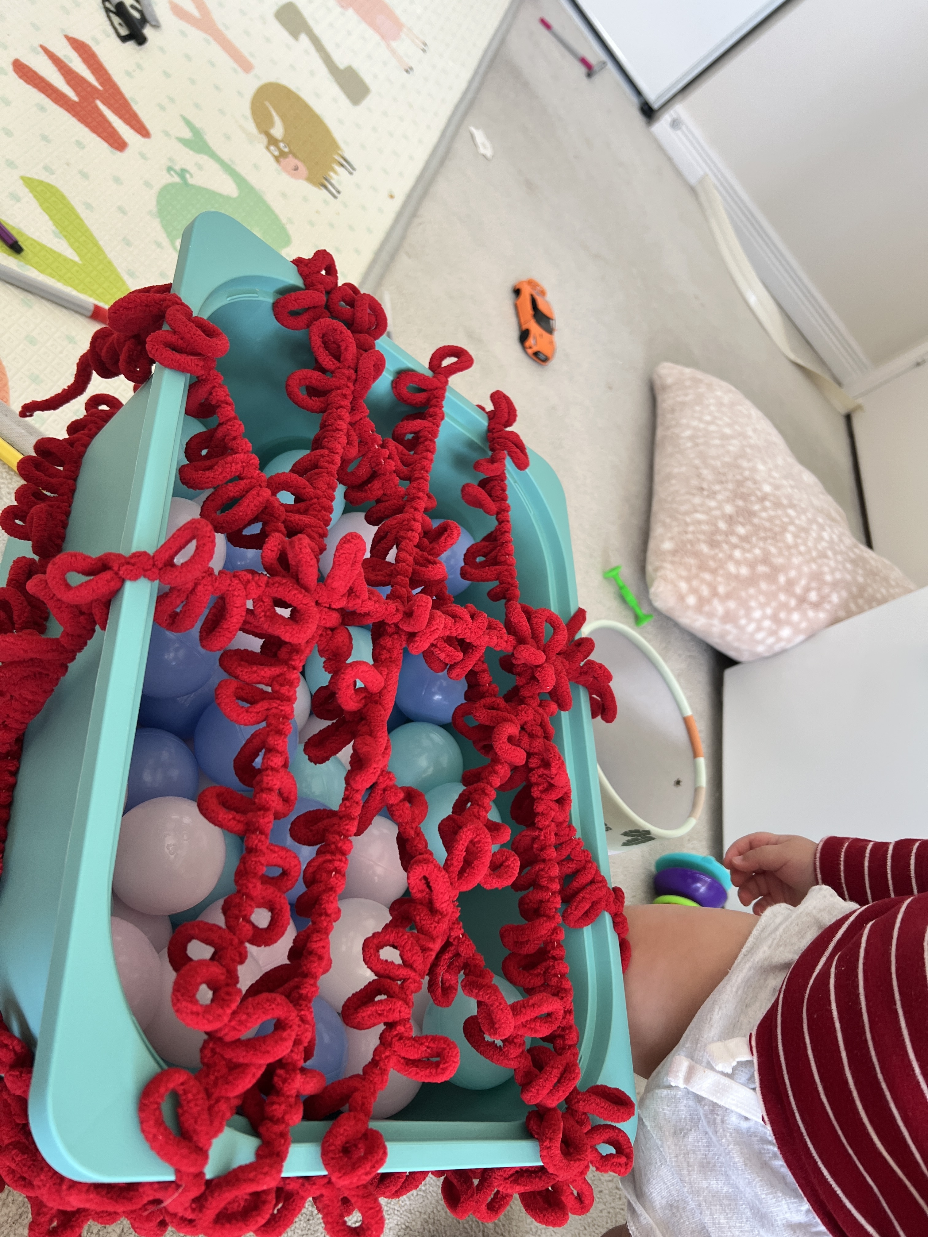 Ay ben genelde yere battaniyeyi korum ustune de oyun halisini korum orda oynar oyun halisindaki butun oyuncaklari cikartir yuz ustu doner kendi kendine bagrir oyuncakların etiketlerini kurdelelerini emmeye bayiliyir