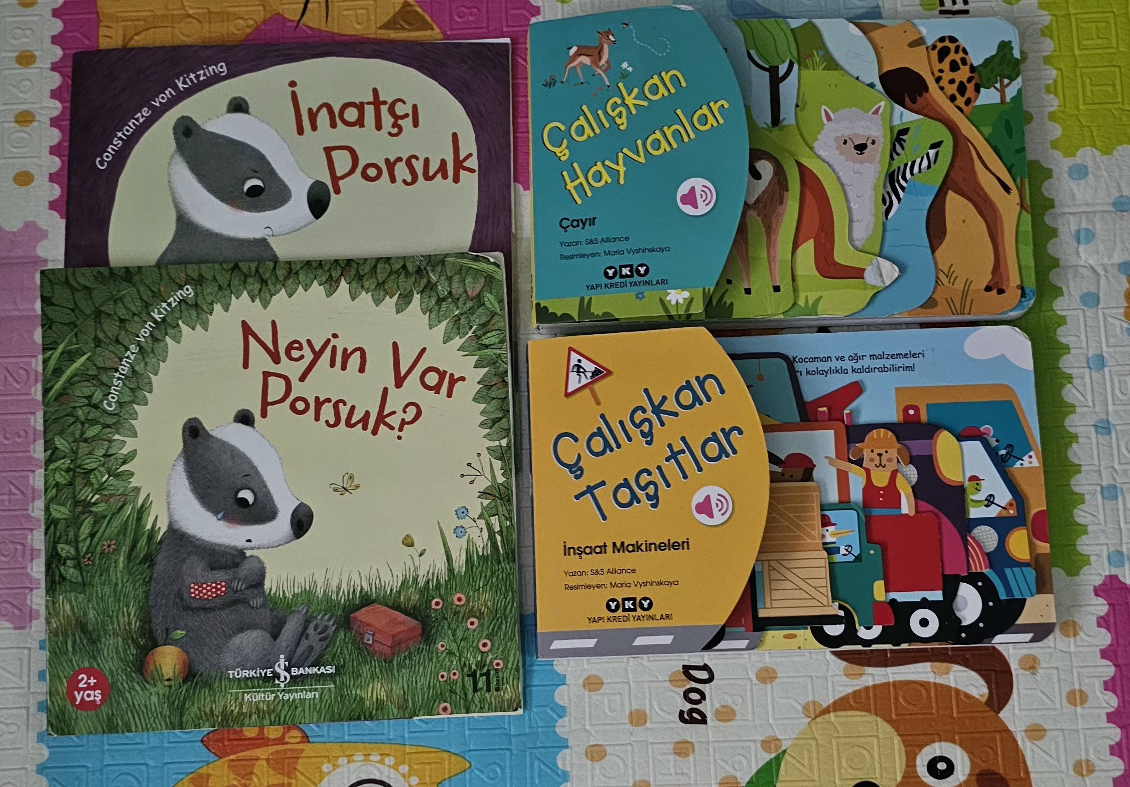 Malumunuz daha küçükken hışırtılı kitap, tummy time kartları, minik kitaplarla ilgilendik. 1 yaş sonrası bebeğimizle beraber kitaplar da büyüdü. Şu an evimizde değiliz yanımızdaki kitapları fikir olsun niyetiyle gönderiyorum. Her gün okuduğumuz birkaç çocuk dergisi daha var. Uzun zamandır kitap okuduğumuz için çok da fazla ilgileniyor, kendisi seçip açıyor, hayvanlari gösteriyor. Ben konuşa konuşa anlatırım hep, o da açınca başladı bu aralar bir şeyler diyor gösteriyor bana