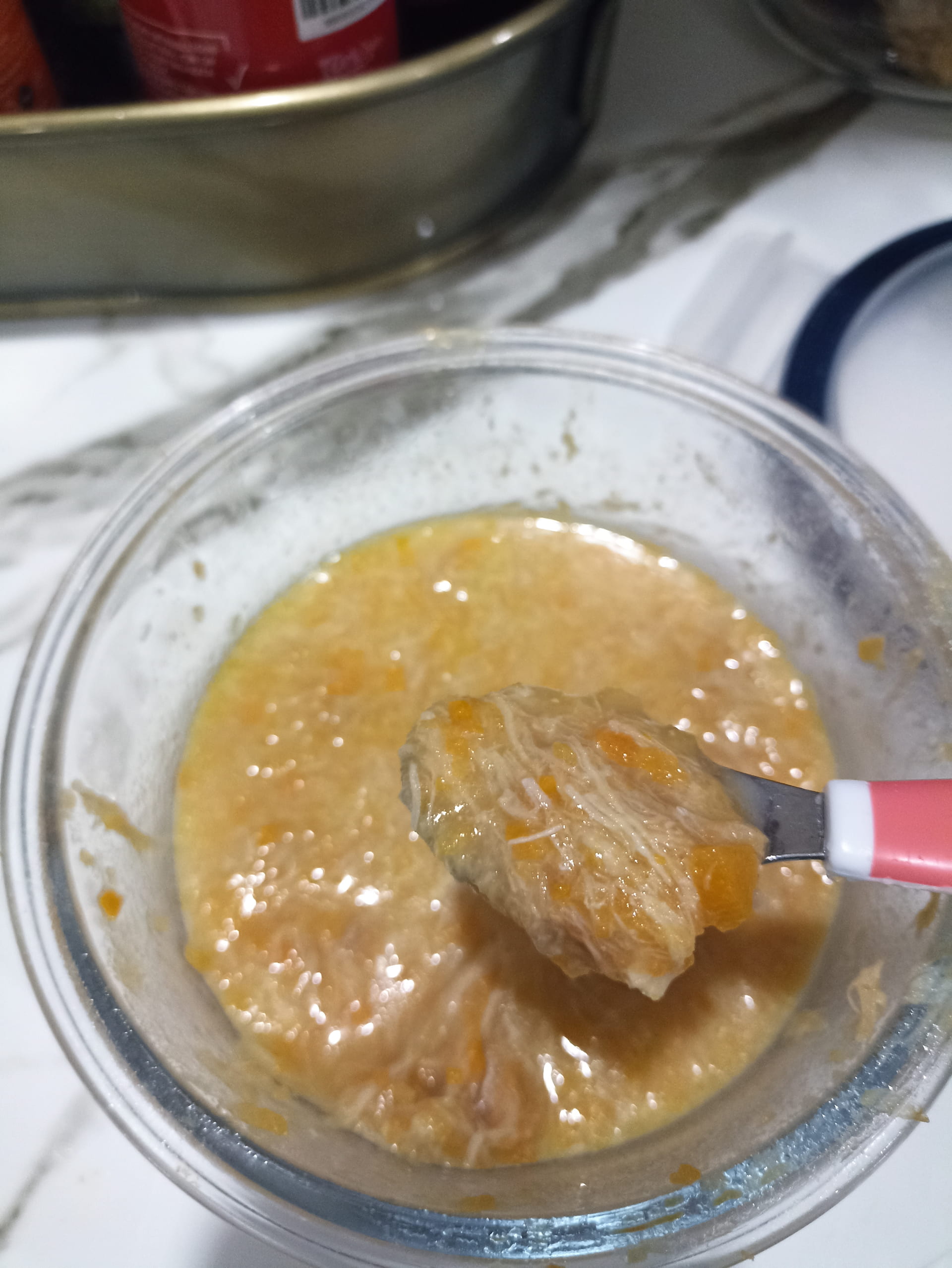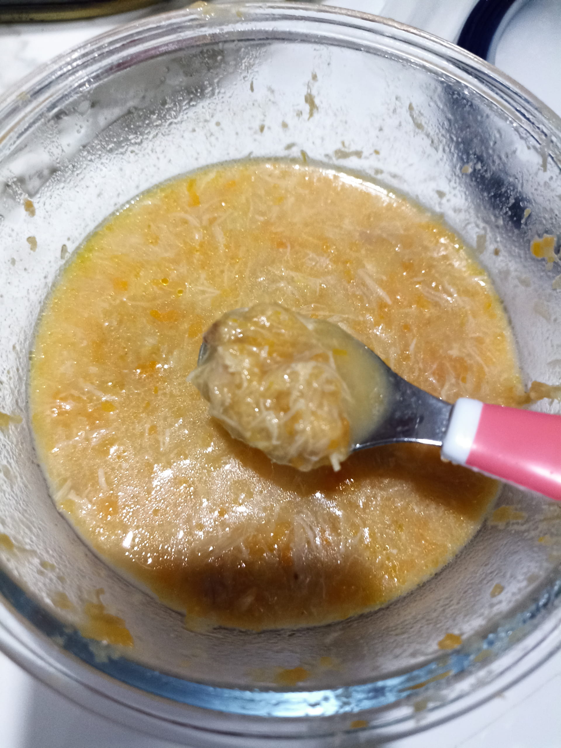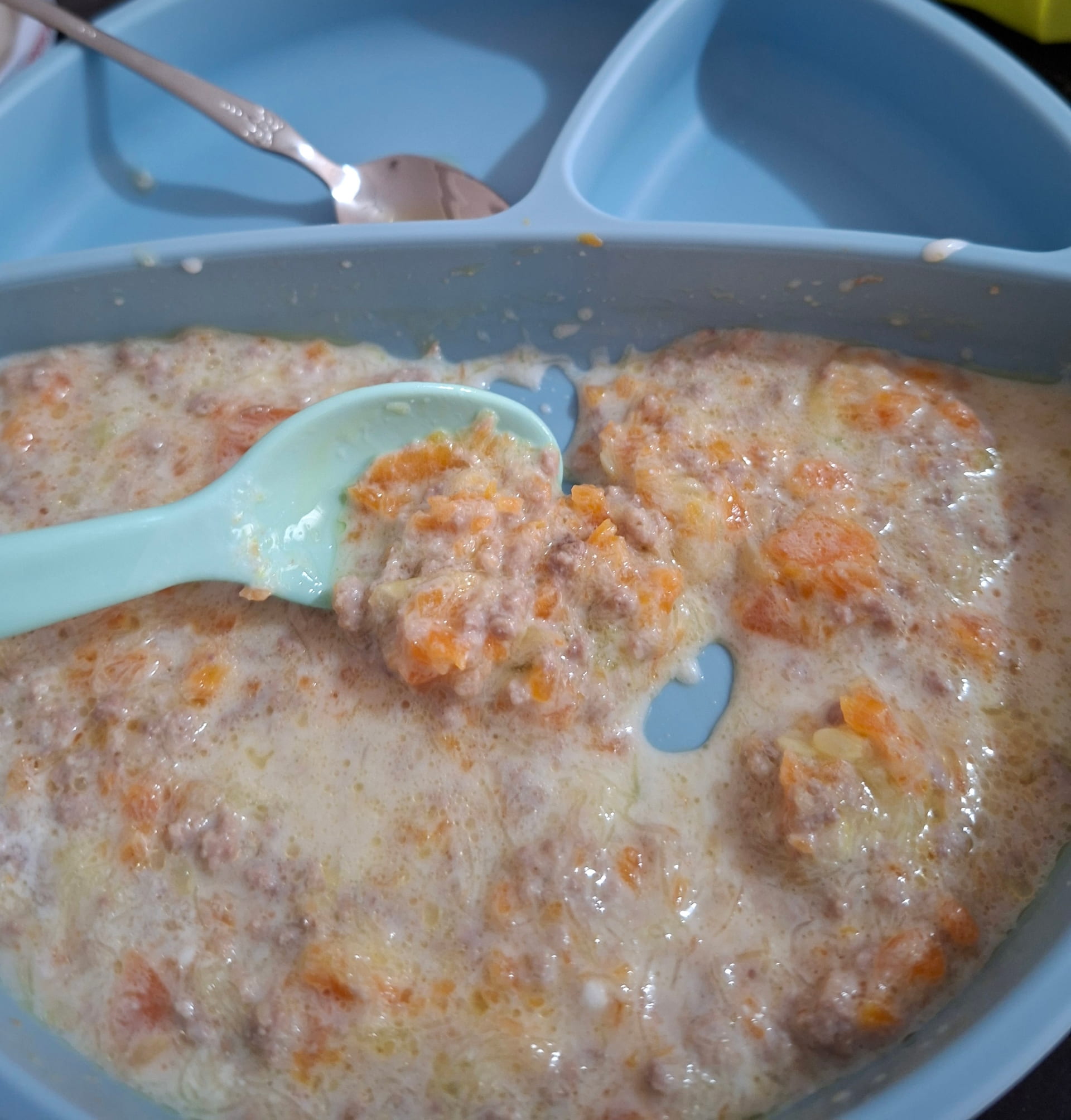 Uyanınca ve gece 2 kere mama veriyorum. Aç karnına ek gıda veriyorum. Bak mesela az önce kıymayı bu şekil verdim ama yutamıyor sürekli öğürüp öksürüyor. Çiğnenmiyor. Sen ne şekilde veriyosun. Bunda kabak, havuç ve kuzu kıyma var. Suda haşlayarak yaptım