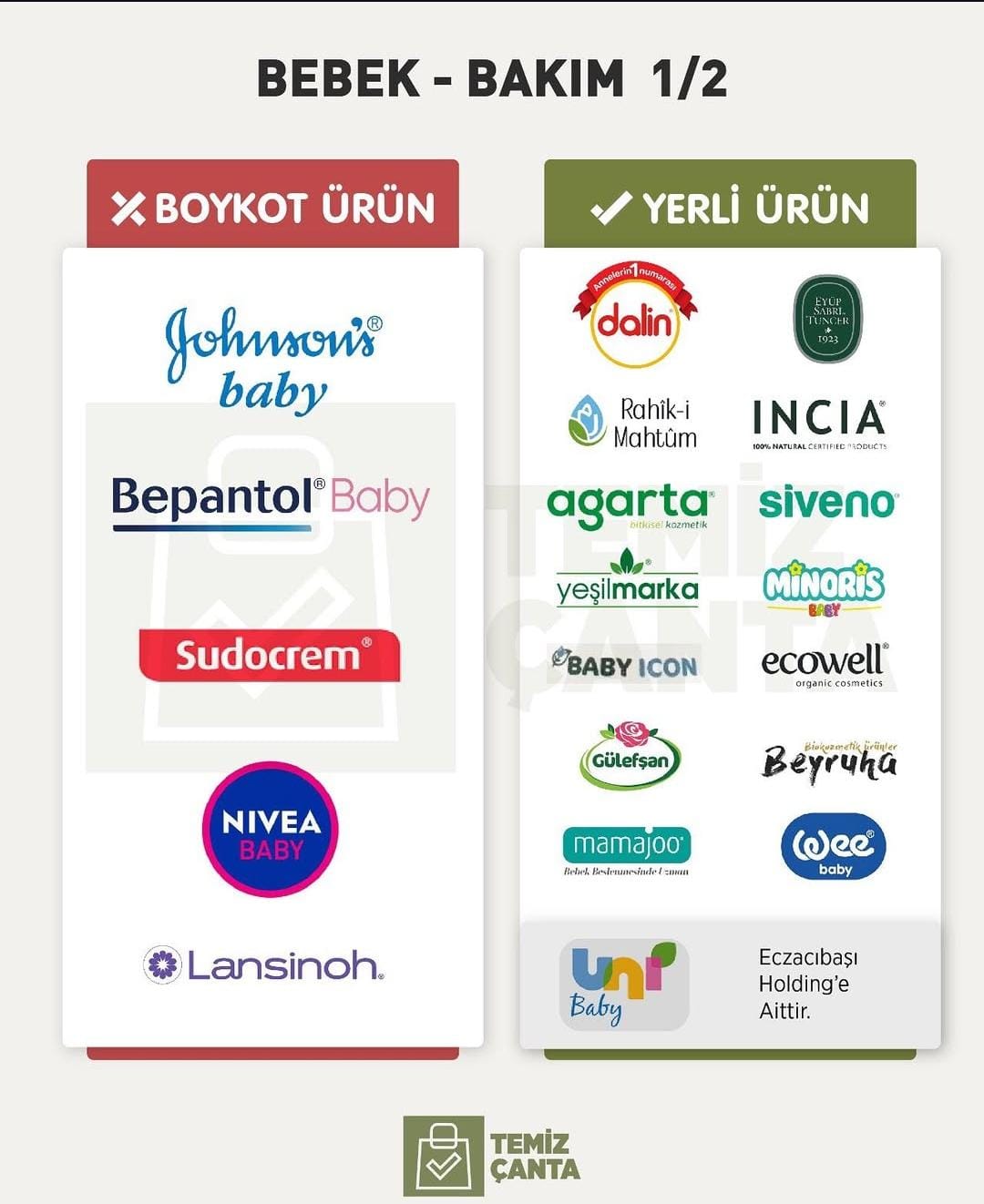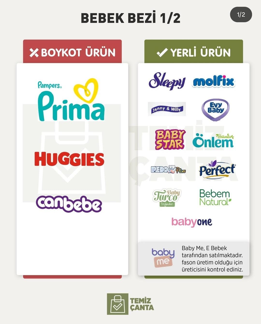 Yıllardır başta İsrail ve Amerika olmak üzere zalim Çin’i de boykot etmeye çalışan biri olarak tavsiyem: Wee Baby. Uygun fiyatlı ve kaliteli. “Burda Bebek” şirketine ait. Türk malıdır.